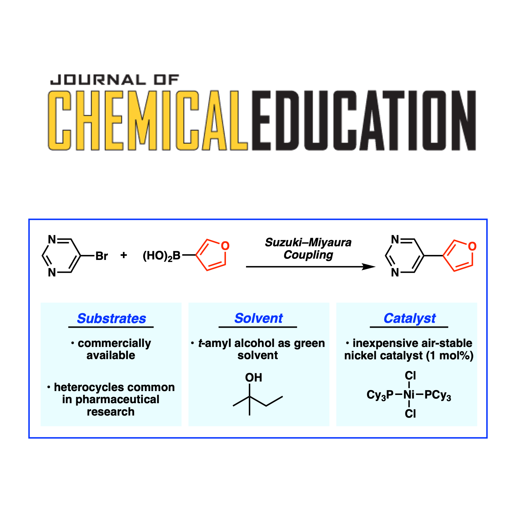 With generous support from the American Chemical Society's Green Chemistry Institute Pharmaceutical Roundtable, we developed this undergraduate chemistry laboratory experiment that provides an opportunity for students to learn about cross-coupling reactions, non-precious metal catalysis, green chemistry, and heterocyclic compounds.